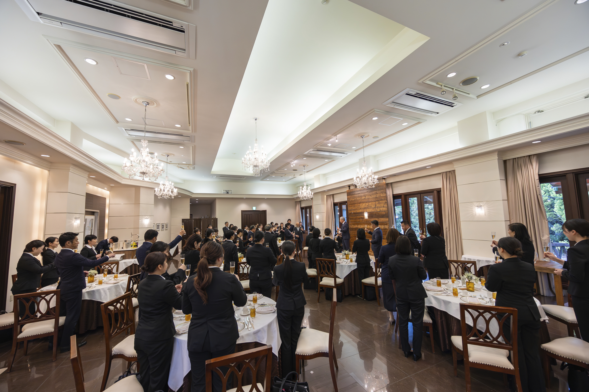 また、入社式の後には、自社式場自慢のコース料理を楽しみながら、和やかな雰囲気の中で懇親会が行われました。新入社員と既存社員が交流を深め、笑顔あふれるひとときとなりました。